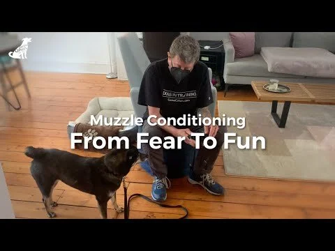 Once your dog is comfortable, present the muzzle say "Muzzle" and when put their snout in to get the food mark with a "Yes" or Clicker